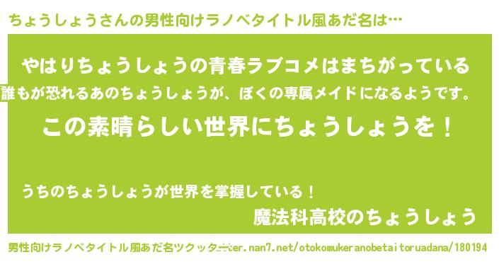 | 胡散臭い通販商品みたいなあだ名 | 『あなたにだけ特別に提供する100年もののヴィンテージワイン…その名も「ちょうしょう」』 |