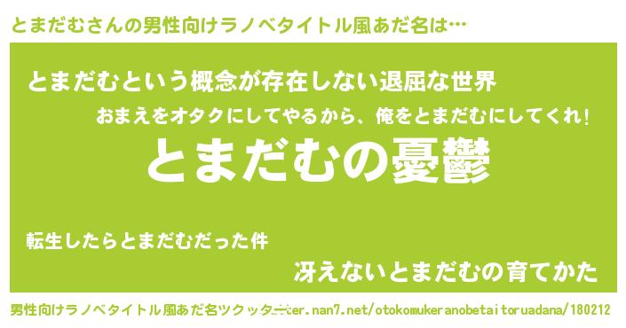 | 胡散臭い通販商品みたいなあだ名 | 『必ず成功する霊験あらたかなお札…その名も「とまだむ」』 |