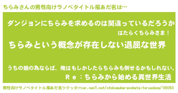 | 女子向けラノベタイトル風あだ名 | 『異世界で失敗しない100のちらみ』 |