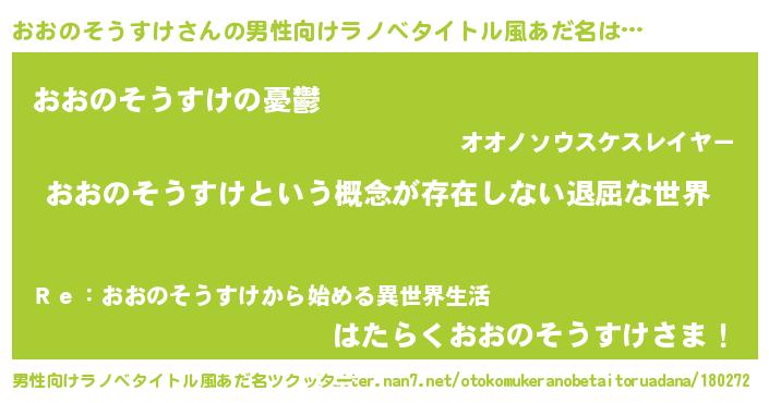 | 女子向けラノベタイトル風あだ名 | 『異世界で失敗しない100のおおのそうすけ』 |
