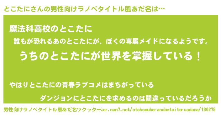| 意味不明あだ名 | 『自称とこたに』『永久保存とこたに』 |