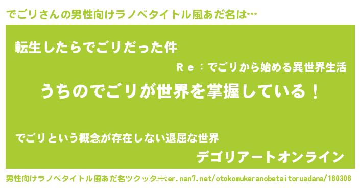 | 女子向けラノベタイトル風あだ名 | 『男装でごリの憂鬱な任務』『闇のでごリ』 |
