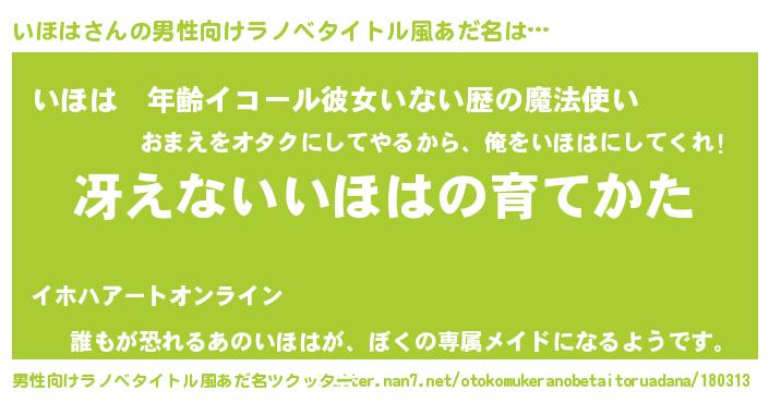 | 胡散臭い通販商品みたいなあだ名 | 『来世でも幸せになれる水素水…その名も「いほは」』 |