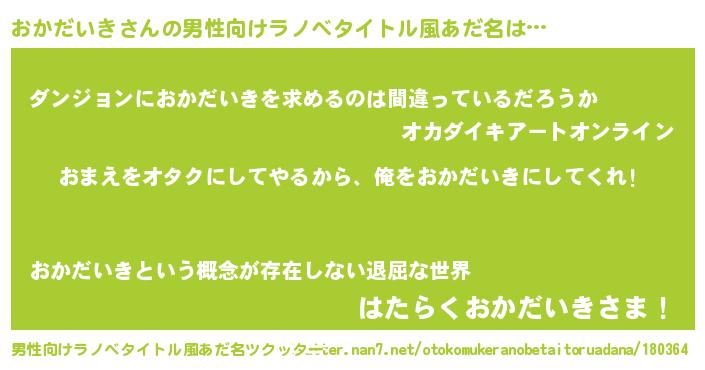 | 女子向けラノベタイトル風あだ名 | 『おかだいき夫妻のなれそめ』 |