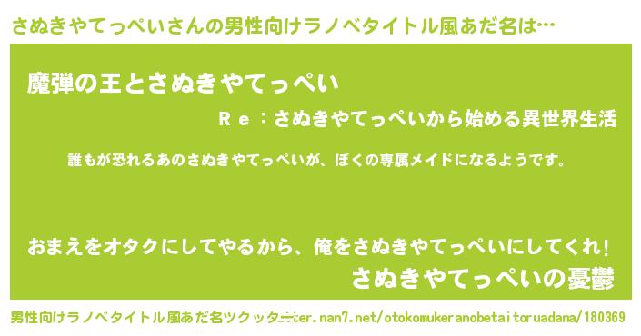 | 女子向けラノベタイトル風あだ名 | 『さぬきやてっぺいの契約王妃』 |