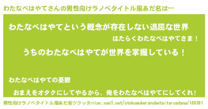 | 女子向けラノベタイトル風あだ名 | 『男装わたなべはやての憂鬱な任務』 |