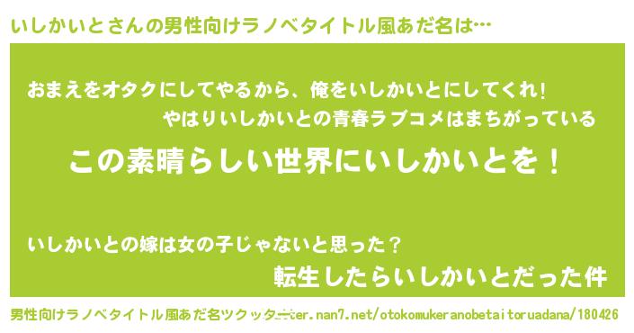 | 胡散臭い通販商品みたいなあだ名 | 『あなたにだけ特別に提供する100年もののヴィンテージワイン…その名も「いしかいと」』 |