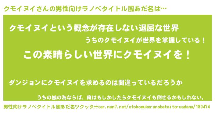 | 意味不明あだ名 | 『住所不定無職クモイヌイ(91歳)』 |