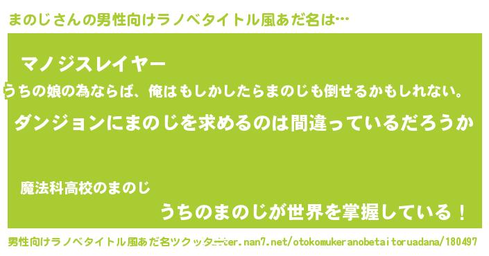| 女子向けラノベタイトル風あだ名 | 『まのじの卵を拾いまして』 |
