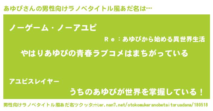 | 女子向けラノベタイトル風あだ名 | 『あゆぴ伯爵の花嫁』『死神あゆぴの再婚』 |