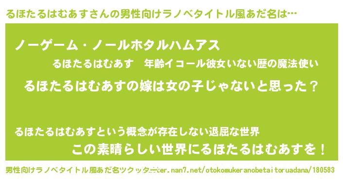 | 女子向けラノベタイトル風あだ名 | 『るほたるはむあす様がみてる』 |