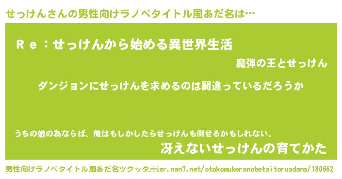 | ヒーロー風カッコイイあだ名 | 『黄金騎士セッ』『最強戦士セッケン』 |