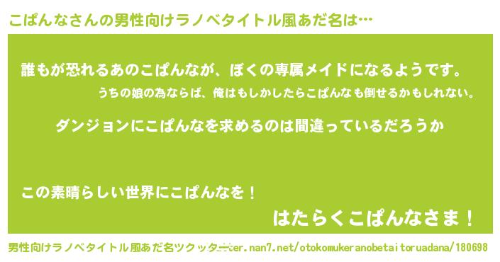 | 女子向けラノベタイトル風あだ名 | 『こぱんなの卵を拾いまして』 |