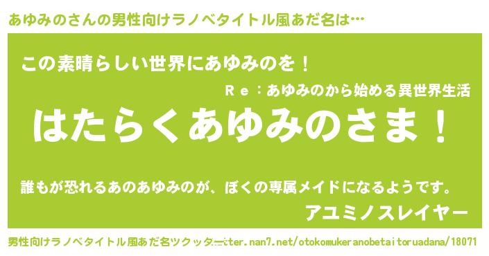 | ヒーロー風カッコイイあだ名 | 『仮面アユダー』『最強戦士アユミノ』 |