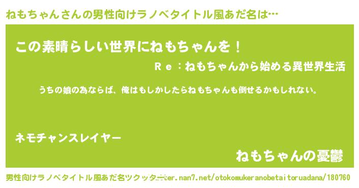 | 女子向けラノベタイトル風あだ名 | 『ねもちゃんの婚約者』『闇のねもちゃん』 |