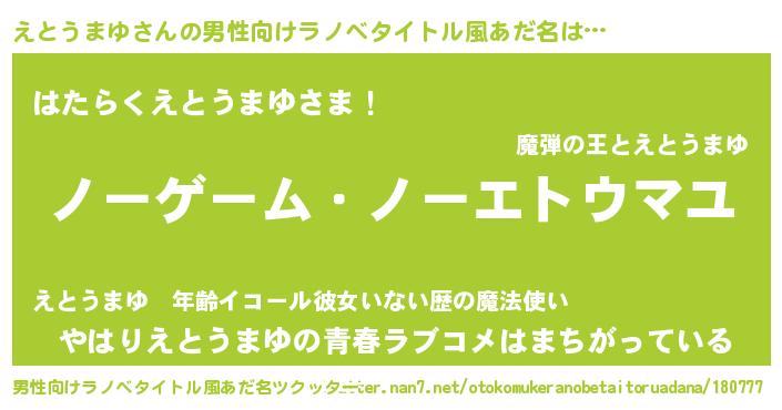 | 女子向けラノベタイトル風あだ名 | 『死神えとうまゆの再婚』 |
