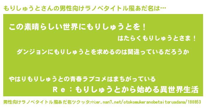 | 女子向けラノベタイトル風あだ名 | 『もりしゅうとは平凡を望む』 |