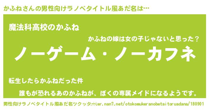| 女子向けラノベタイトル風あだ名 | 『死神かふねの再婚』『かふねの契約王妃』 |