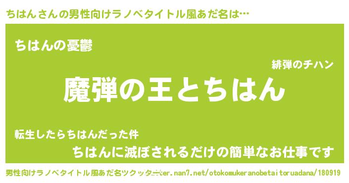 | 女子向けラノベタイトル風あだ名 | 『ちはんが死なない童話 林檎のちはんの診療簿』 |