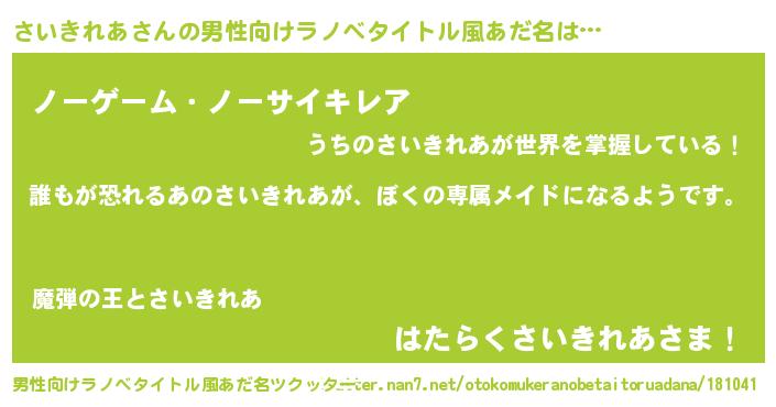 | 女子向けラノベタイトル風あだ名 | 『異世界でカフェさいきれあを開店しました。』 |