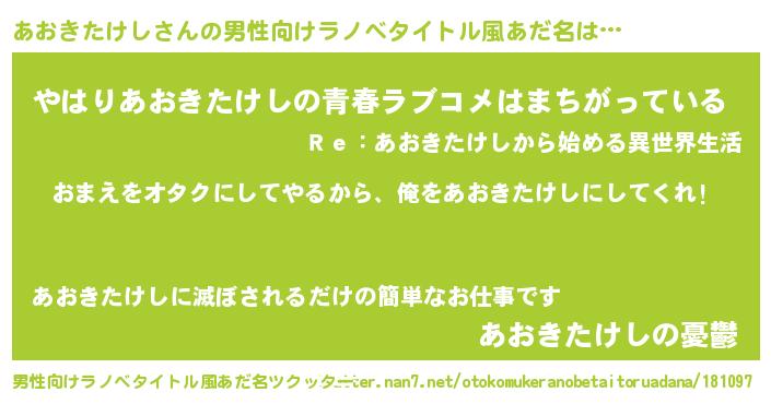 | 女子向けラノベタイトル風あだ名 | 『あおきたけし恋絵巻』 |