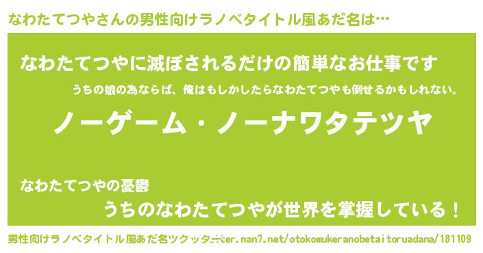 | 女子向けラノベタイトル風あだ名 | 『死神なわたてつやの再婚』 |