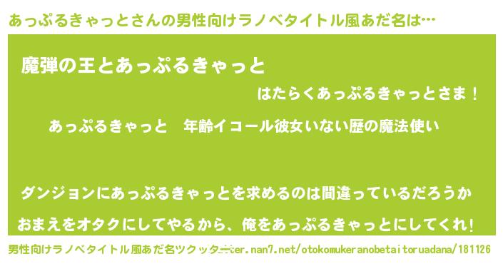 | 伝説のあだ名 | 『救世主となる錬金術士あっぷるきゃっと』 |