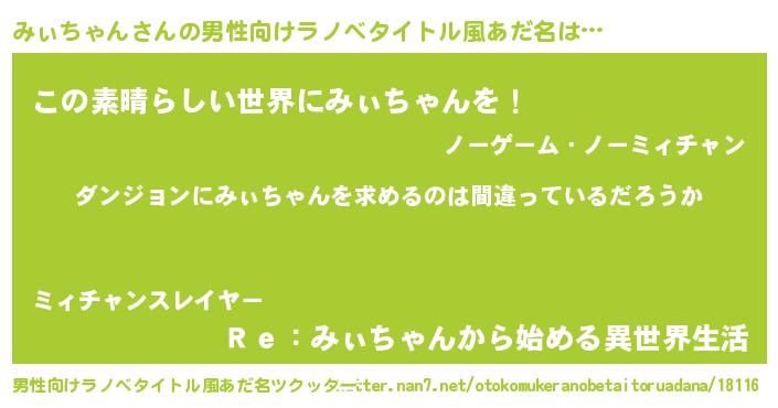 | 女子向けラノベタイトル風あだ名 | 『みぃちゃんの卵を拾いまして』 |