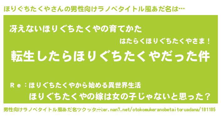 | 女子向けラノベタイトル風あだ名 | 『ほりぐちたくやの玉の輿計画!』 |