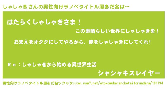 | 女子向けラノベタイトル風あだ名 | 『しゃしゃき夫妻のなれそめ』 |