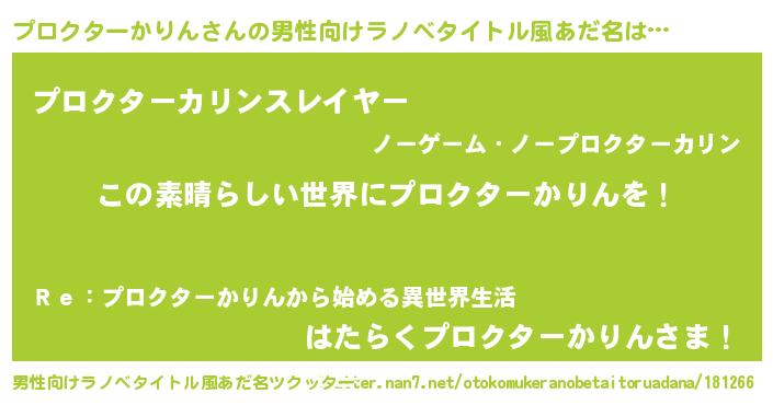 | 女子向けラノベタイトル風あだ名 | 『乙女ゲームの破滅フラグしかない悪役プロクターかりんに転生してしまった…』 |