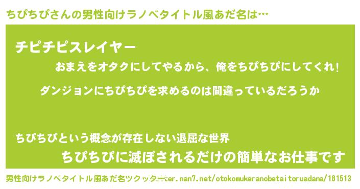 | 胡散臭い通販商品みたいなあだ名 | 『信頼と実績のサプリメント…その名も「ちぴちぴ」』 |
