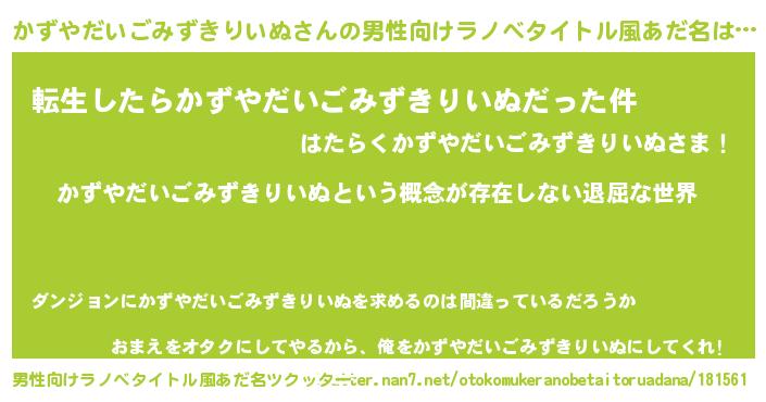 | 女子向けラノベタイトル風あだ名 | 『異世界で失敗しない100のかずやだいごみずきりいぬ』 |