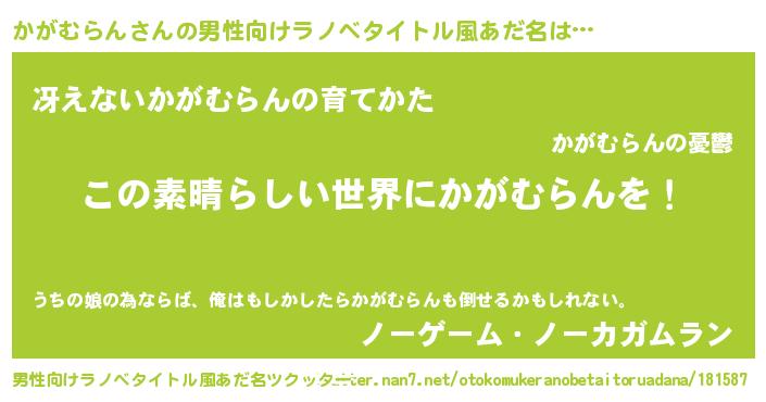 | 女子向けラノベタイトル風あだ名 | 『乙女ゲームの破滅フラグしかない悪役かがむらんに転生してしまった…』 |
