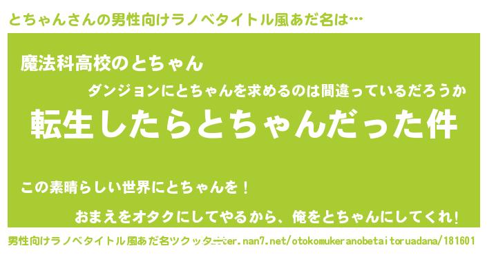 | 女子向けラノベタイトル風あだ名 | 『とちゃんの玉の輿計画!』 |