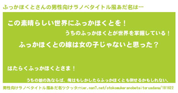 | 女子向けラノベタイトル風あだ名 | 『ふっかほくとの卵を拾いまして』 |