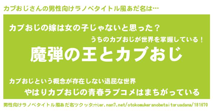 | 女子向けラノベタイトル風あだ名 | 『カブおじが死なない童話 林檎のカブおじの診療簿』 |