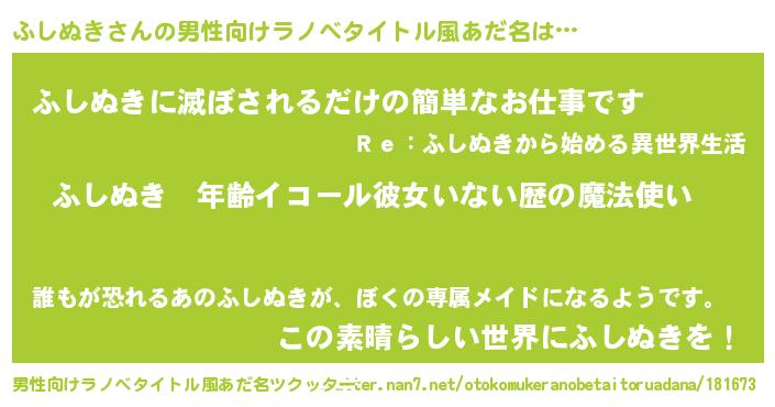 | 女子向けラノベタイトル風あだ名 | 『ふしぬきの玉の輿計画!』 |