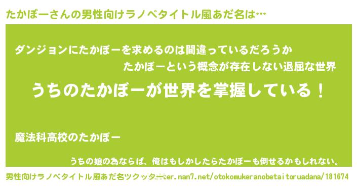 | 胡散臭い通販商品みたいなあだ名 | 『全米が絶賛したサプリメント…その名も「たかぼー」』 |