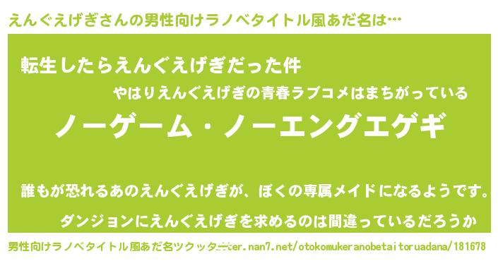 | 女子向けラノベタイトル風あだ名 | 『死神えんぐえげぎの再婚』 |