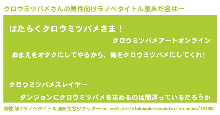 | 女子向けラノベタイトル風あだ名 | 『クロウミツバメ夫妻のなれそめ』 |