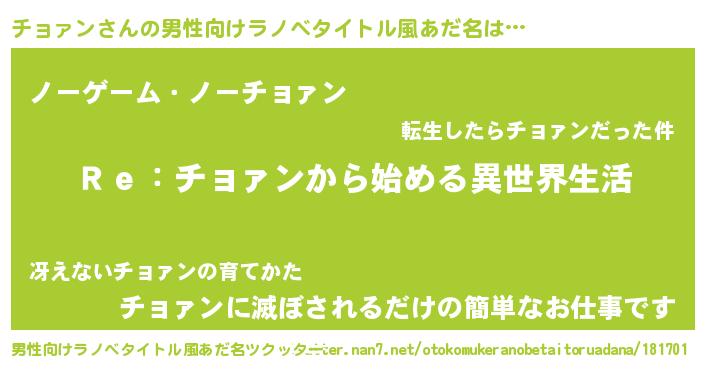 | 意味不明あだ名 | 『自称チョァン』『つくし科チョァン属』 |