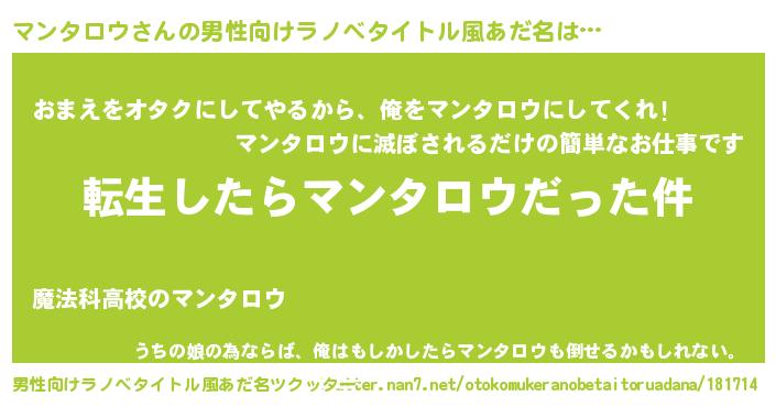 | 女子向けラノベタイトル風あだ名 | 『マンタロウの玉の輿計画!』 |