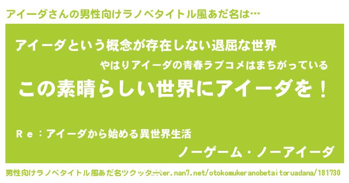 | 意味不明あだ名 | 『住所不定無職アイーダ(77歳)』 |