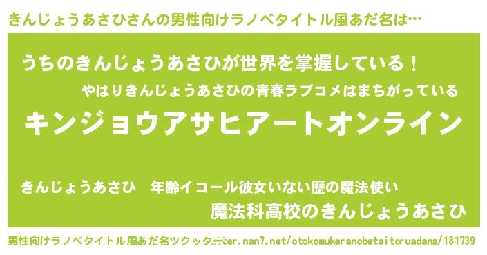| 胡散臭い通販商品みたいなあだ名 | 『モテモテ間違いなし霊験あらたかなお札…その名も「きんじょうあさひ」』 |