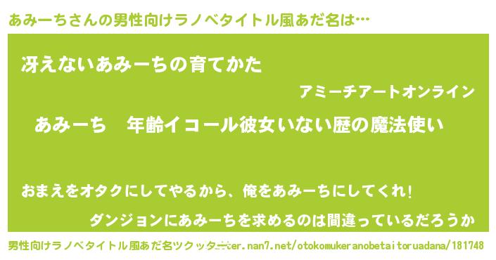あみーちさんの男性向けラノベタイトル風あだ名をツクッター!