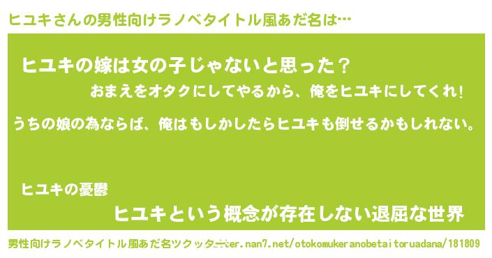 | 女子向けラノベタイトル風あだ名 | 『ヒユキ伯爵の花嫁』 |