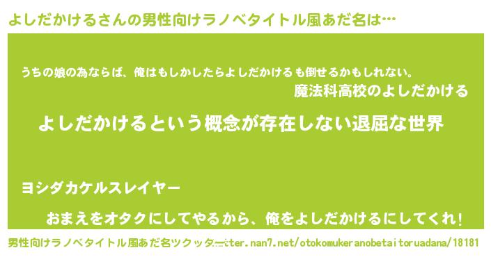 | 女子向けラノベタイトル風あだ名 | 『異世界で失敗しない100のよしだかける』 |