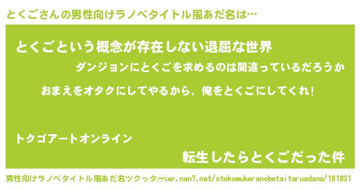 | 女子向けラノベタイトル風あだ名 | 『とくご夫妻のなれそめ』 |