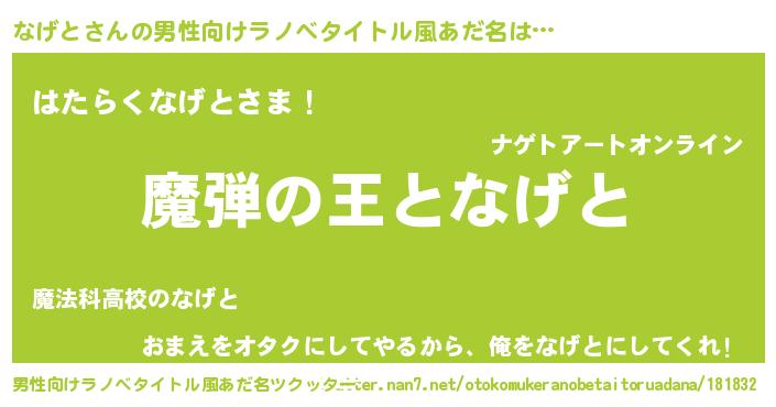 | 女子向けラノベタイトル風あだ名 | 『乙女ゲームの破滅フラグしかない悪役なげとに転生してしまった…』 |